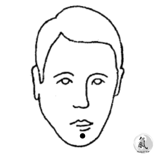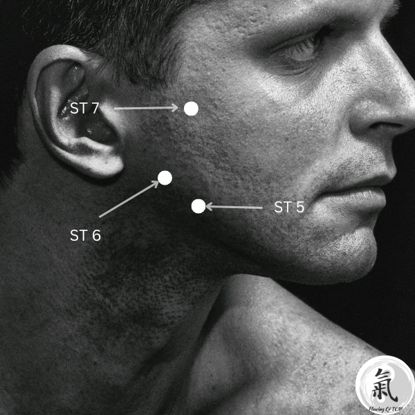 Stomach 5 is located on the lower edge of the jaw, in front of the anterior edge of the masseter muscle. Clench your mouth and feel the muscle contract, Stomach 5 is located just at the end of the muscle, close to the facial artery.