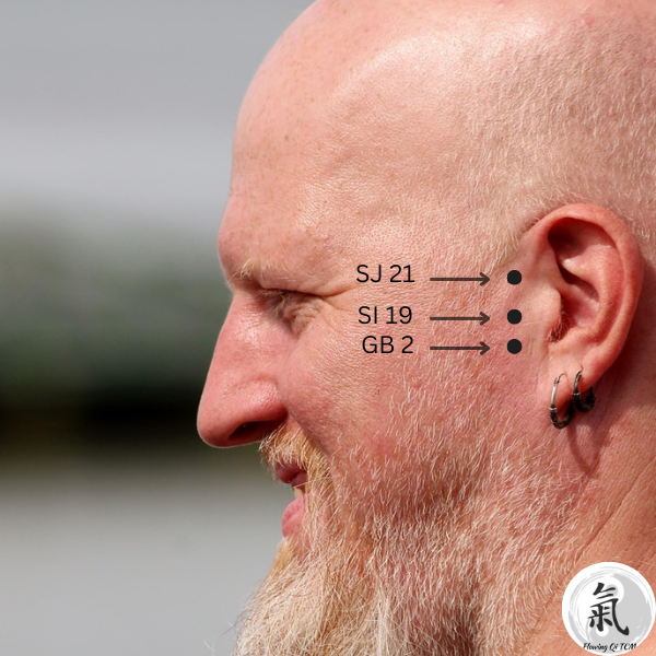 Also located between your ear and the TMJ, you can find this point following the same instructions as the previous point. Run your finger upwards through your jaw looking for your ear, and find the first notch below the ear tragus.